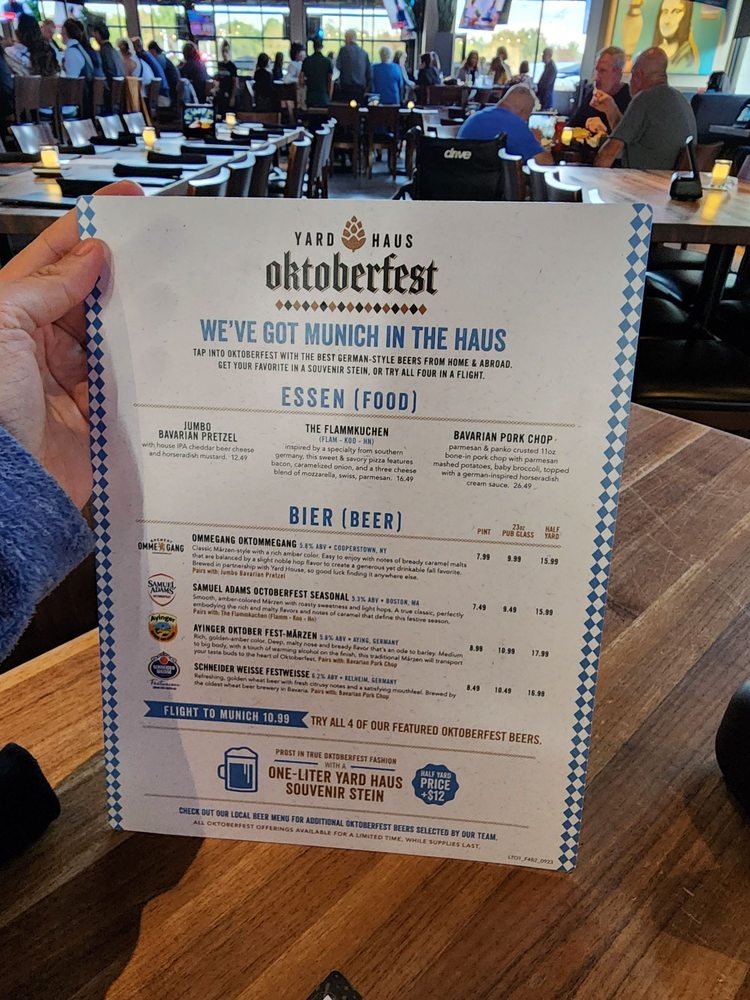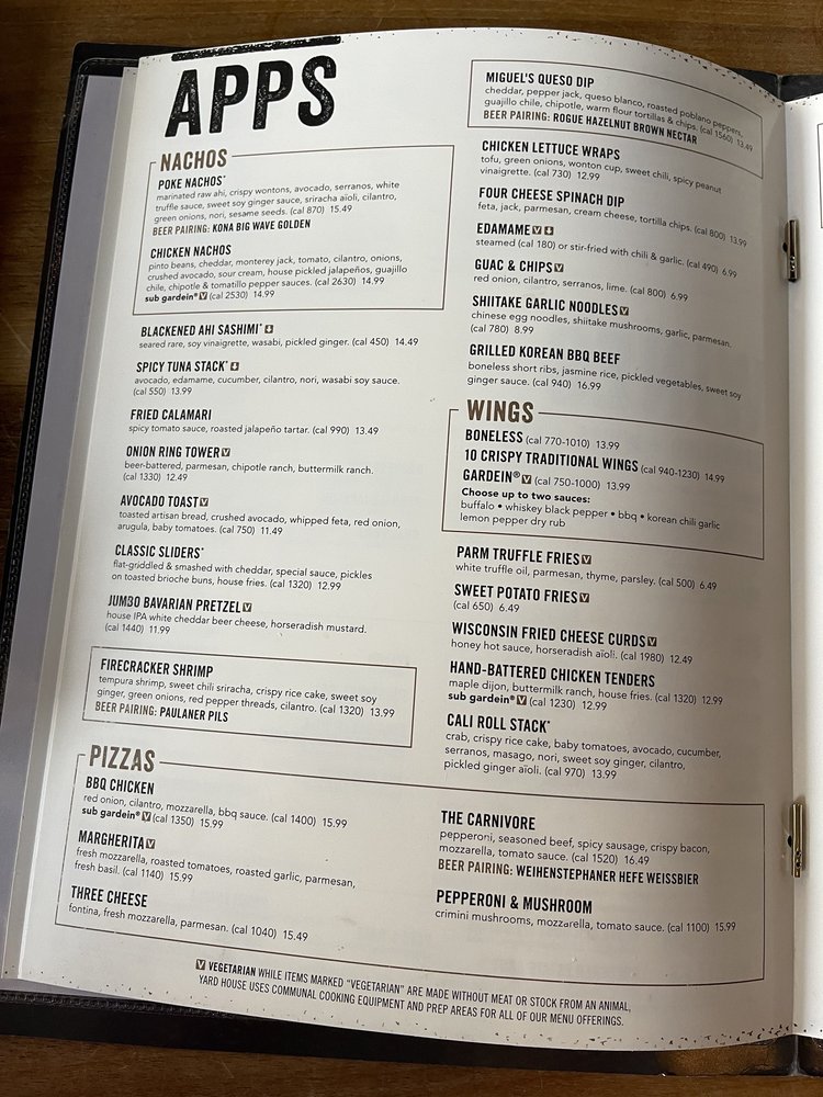 Introducing Yard House, a restaurant brand offering New American and Vegetarian cuisine in a trendy and casual setting. Known for its extensive menu with many vegetarian and vegan options, Yard House also caters to various dietary preferences. With a range of utilities including delivery, takeout, and wheelchair accessibility, customers can enjoy their experience hassle-free. The restaurant provides a family-friendly atmosphere and is praised for exceptional service by attentive staff. The menu boasts unique cocktails like the Lavender Drop and Dragon Fruit Cosmo, alongside flavorful dishes such as Gardein wings and vegan nachos. Customers rave about the accommodating staff, vegan-friendly options, and pleasant ambiance. Yard House stands out for its diverse menu, welcoming environment, and commitment to customer satisfaction.